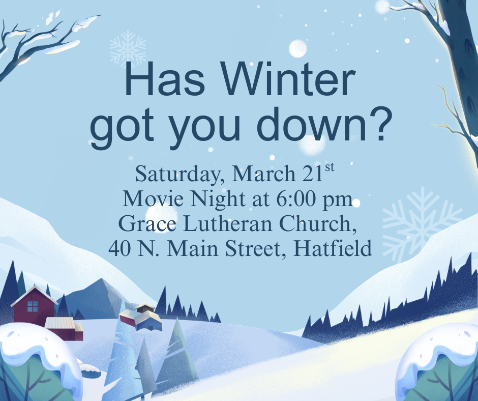 A Cure for the Winter Doldrums: Saturday, March 21st Movie Night at 6:00 pm. More info on our What’s Happening Page.